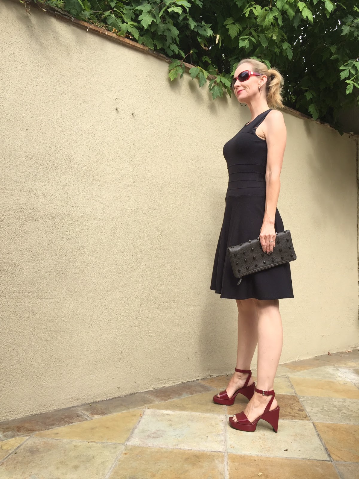 Then I glammed up a bit. Here I spiced up my LBD (little black dress) with red heels and sunnies and the studded clutch.