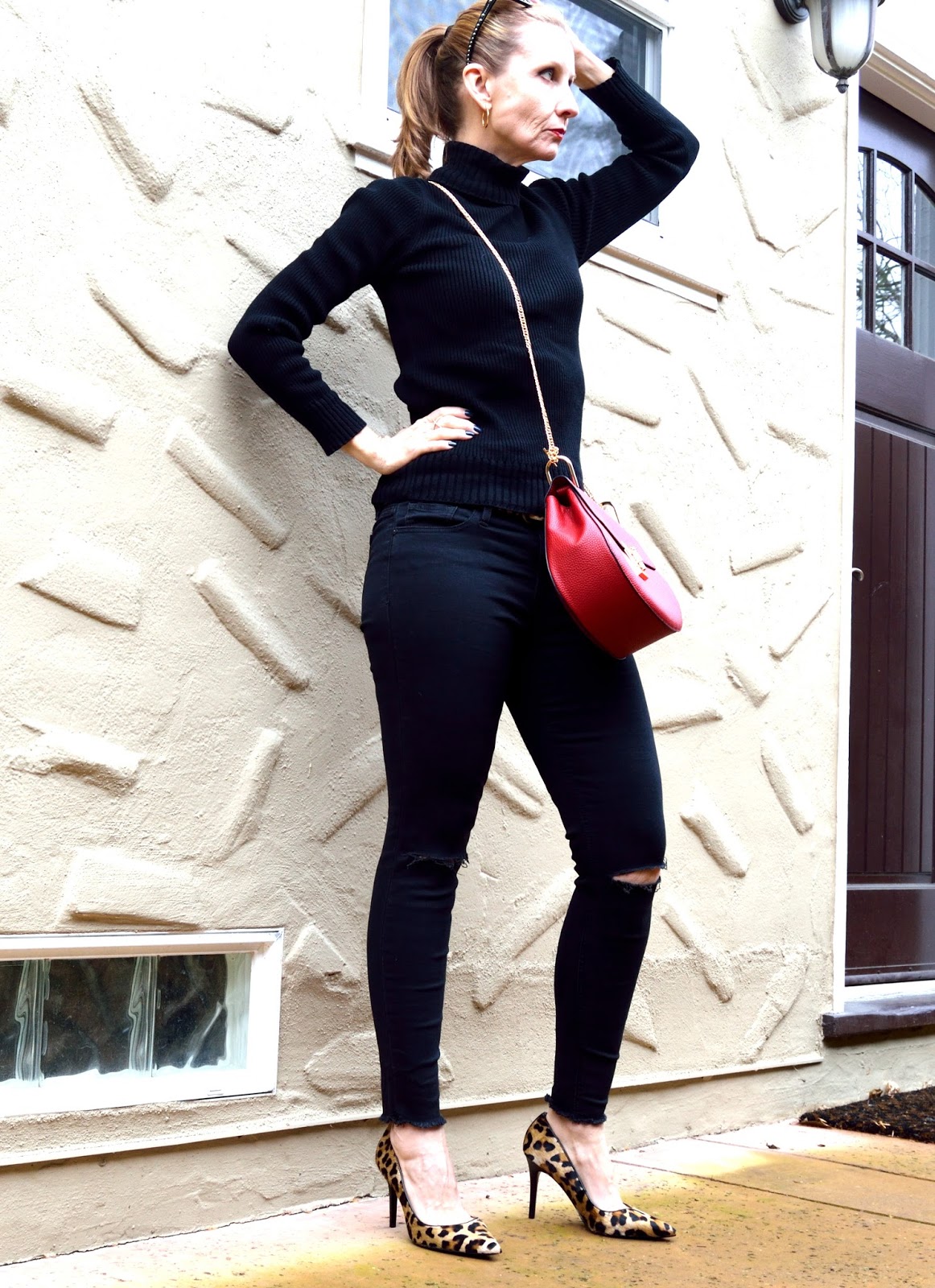 Great look!! Love the ripped black jeans and black top, and of course, your leopard pumps are the perfect exclamation point!! Thank you for hosting!