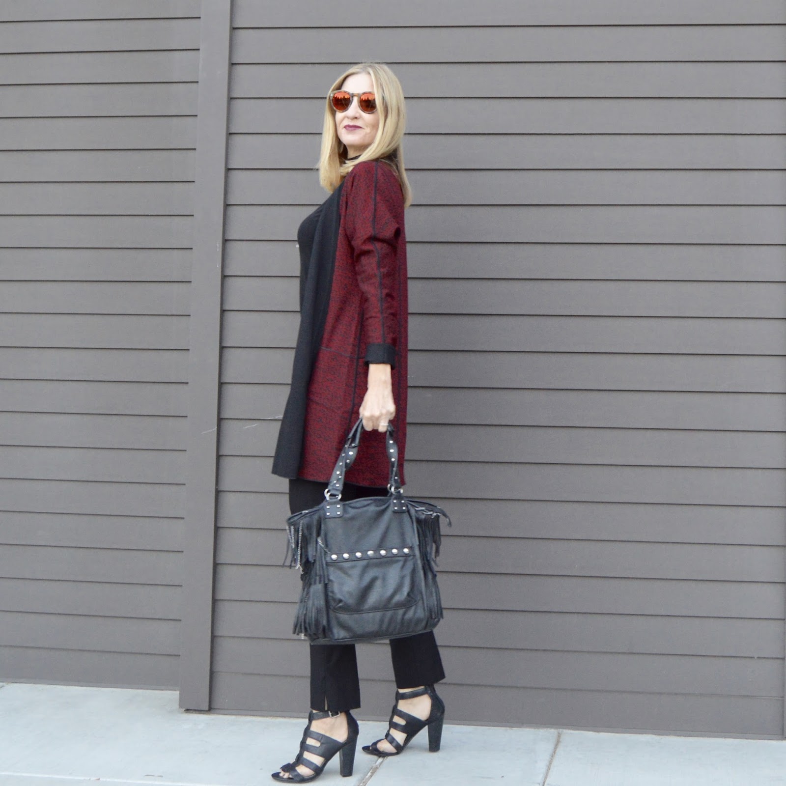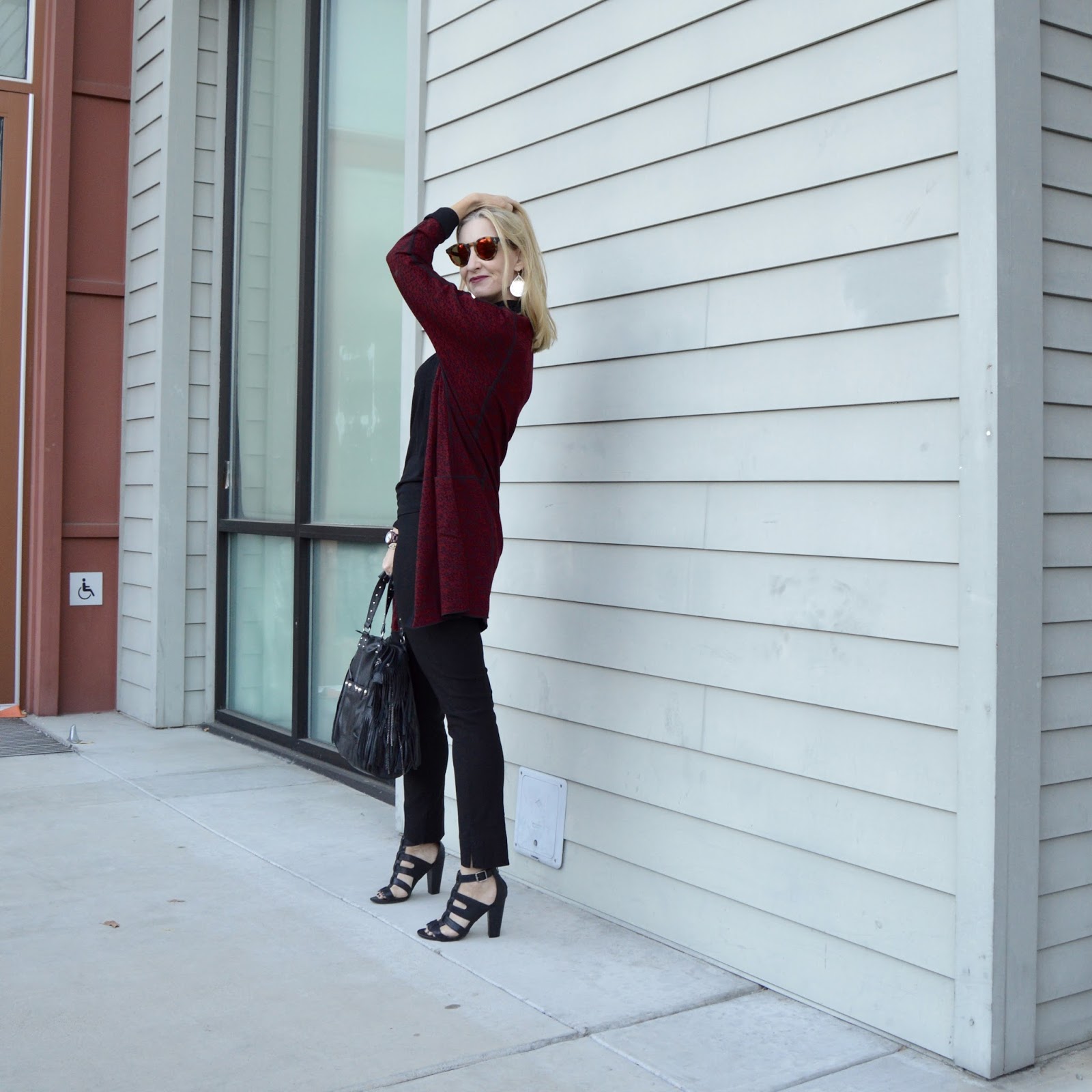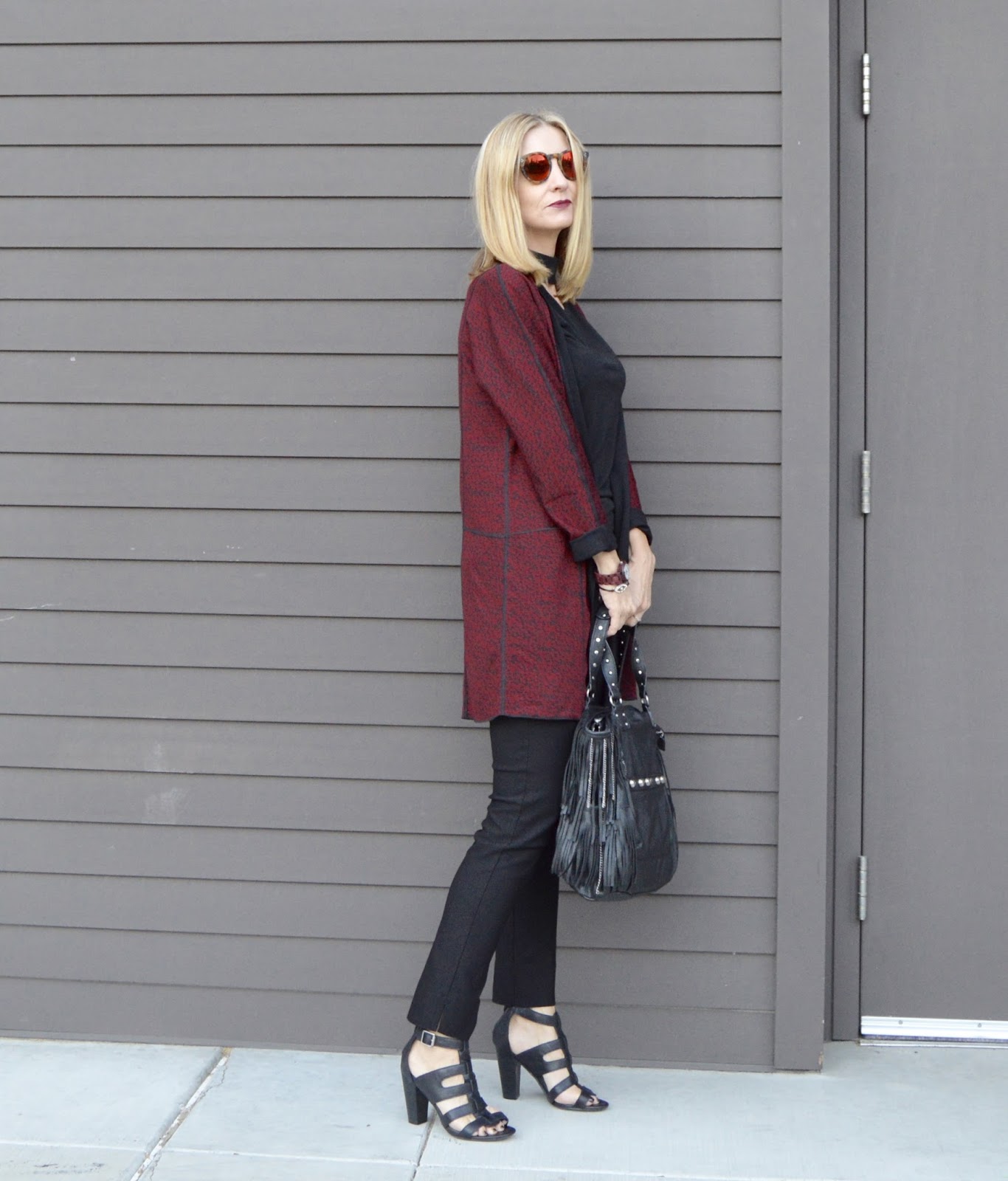Oooh!! I’m LOVING the neckline detail of this new top of yours, dearest Dawn…and the über-flattering pants were kinda made to go with those strappy sandals, weren’t they?? Plus – a reversible kimono in burgundy and black couldn’t be more amazing for fall!! XOXO