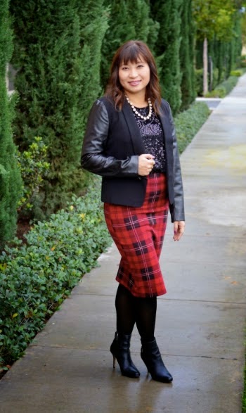 Alice of Happiness at Mid-Life is modeling a stunning holiday look. Sequins and plaid? Yes, please!