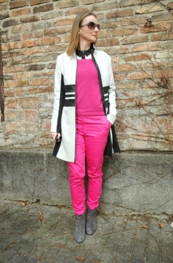 Sabina of Ocean Blue Style is looking so chic in her hot pink ensemble and black and white moto coat.