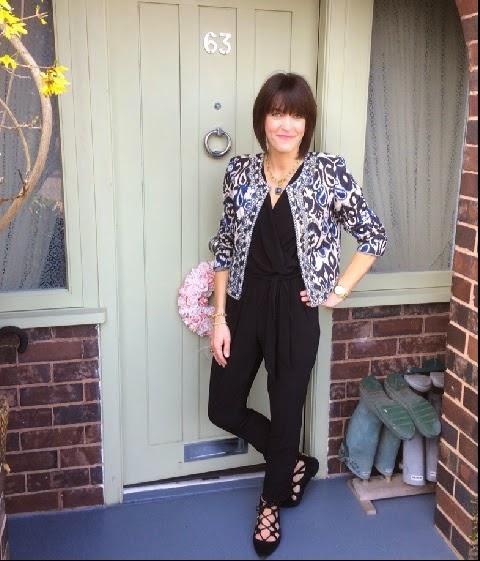 Jane of My Midlife Fashion looks so pretty in her black jumpsuit. Great jacket too, Jane!