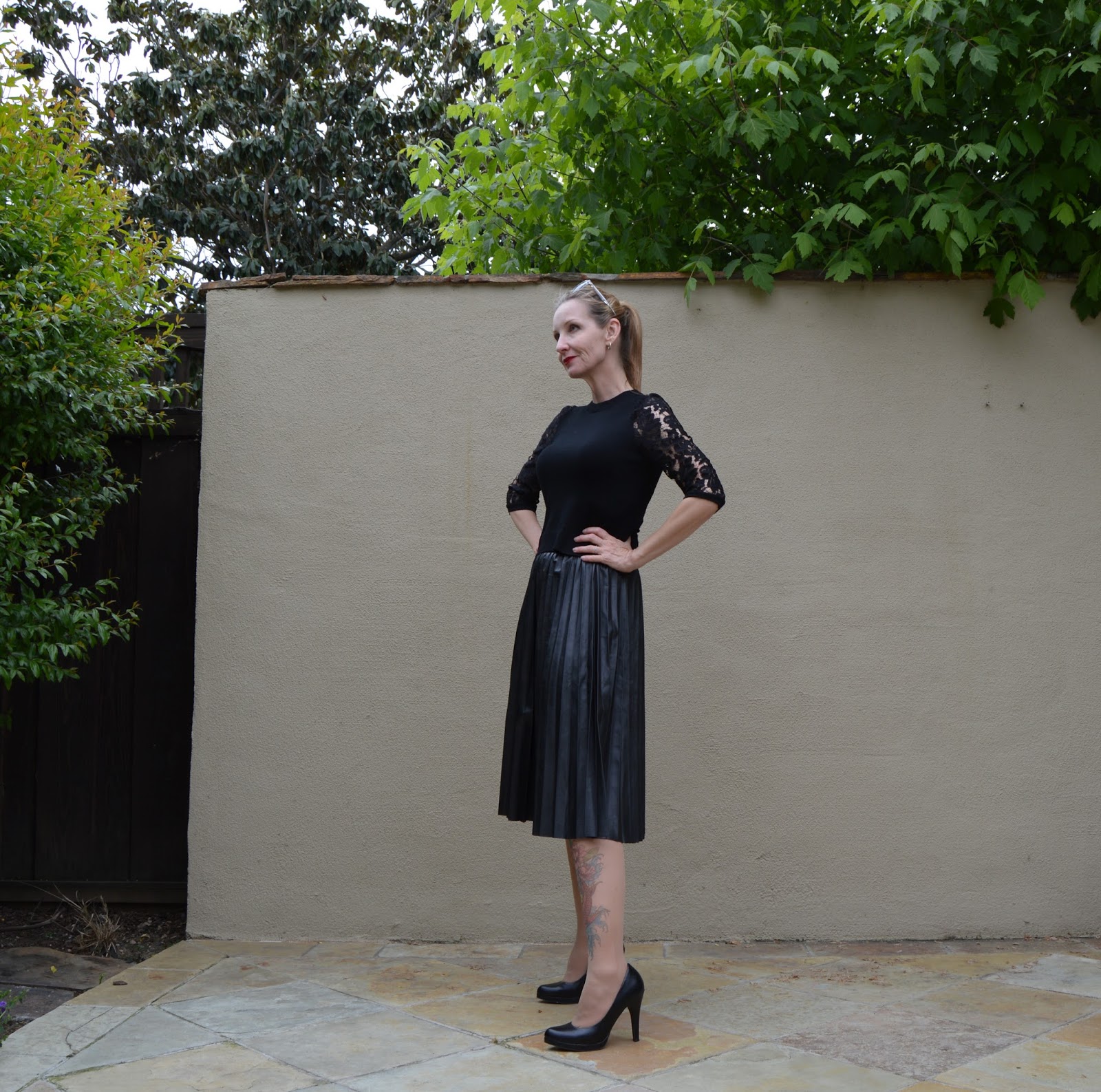 This theme was a challenge for many of us, but that’s half the fun. I decided I needed something new and I found this unusual pleated PU leather skirt. Kinda different and fun, right?